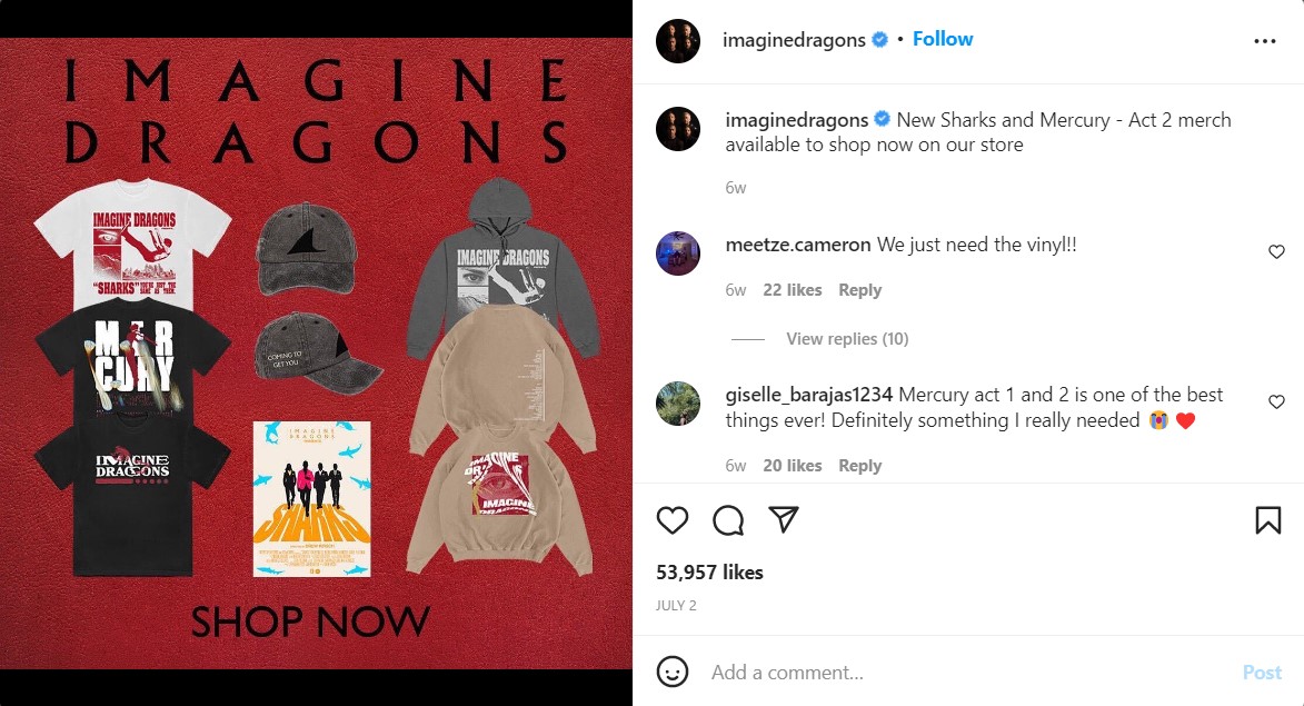همانطور که در مورد سوم پست چرا مرچ اشاره کرده بودیم، فروش مرچ برای گروههای موسیقی و خوانندگان اهمیت ویژهای دارد و میتواند یک جریان درآمدی مستمر و بدون زحمت (Passive) جدیدی برای آنها باشد تا در بین دو کنسرت یا تور، درآمدشان قطع نشود. بقیۀ مزایای فروش مرچ هم طبیعتاً صادق است؛ برای مثال هواداران این گروه با پوشیدن یا استفاده از مرچ ایمجین درگنز، تبدیل به بیلبوردهای تبلیغاتی متحرک و سخنگو میشوند و اطرافیانشان را به گوش دادن آثار این گروه ترغیب میکنند.